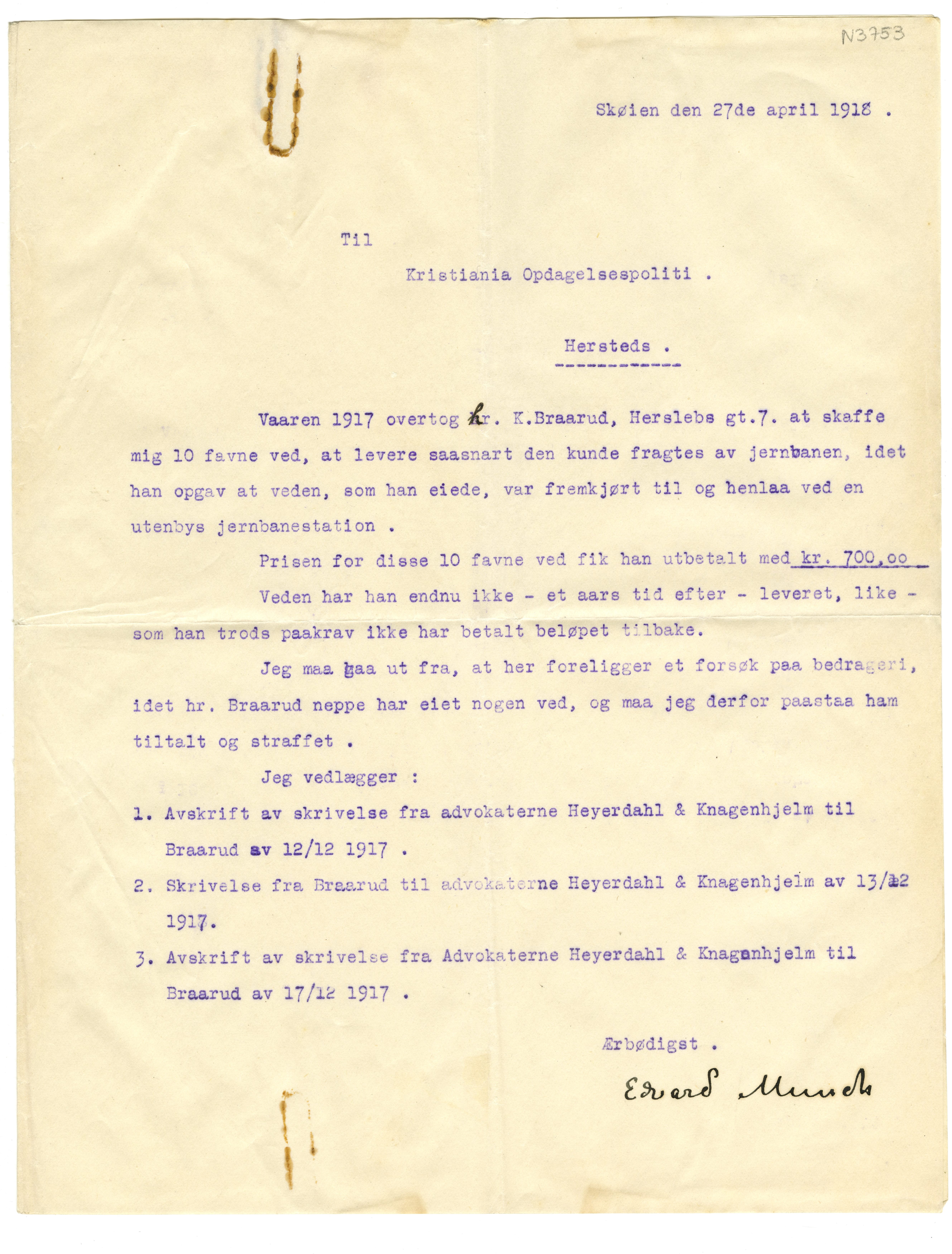 MM N 3753, Munchmuseet. Datert 27.4.1918. Brevutkast til Christiania Politikammer.