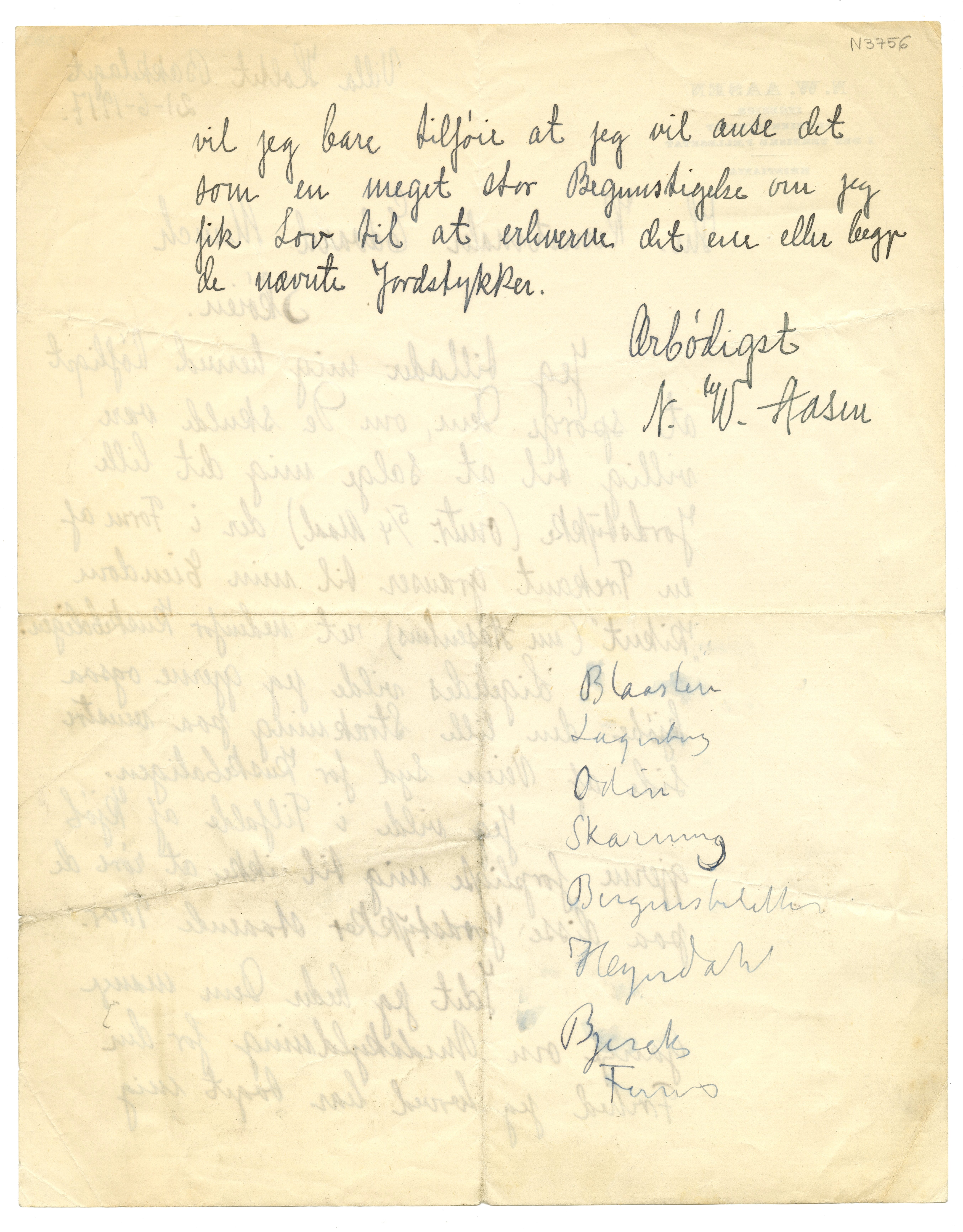 Filologisk kommentar: Samme fysiske objekt som MM K 5380. Brevet er datert 21.6.1917, så notatet må være senere.