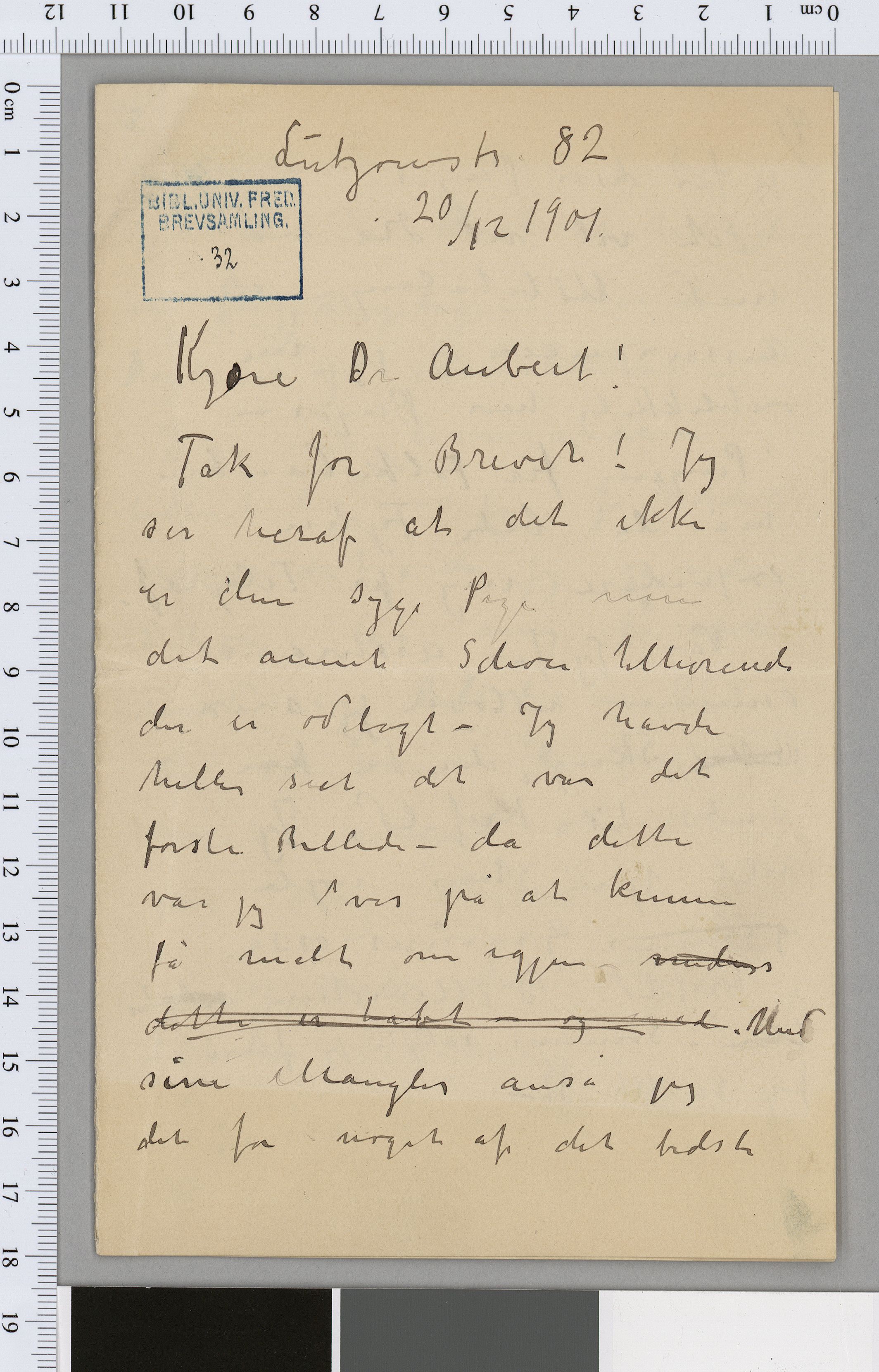 Brevs. 32 (PN 185), Nasjonalbiblioteket. Datert 20.12.1901. Brev til Andreas Aubert