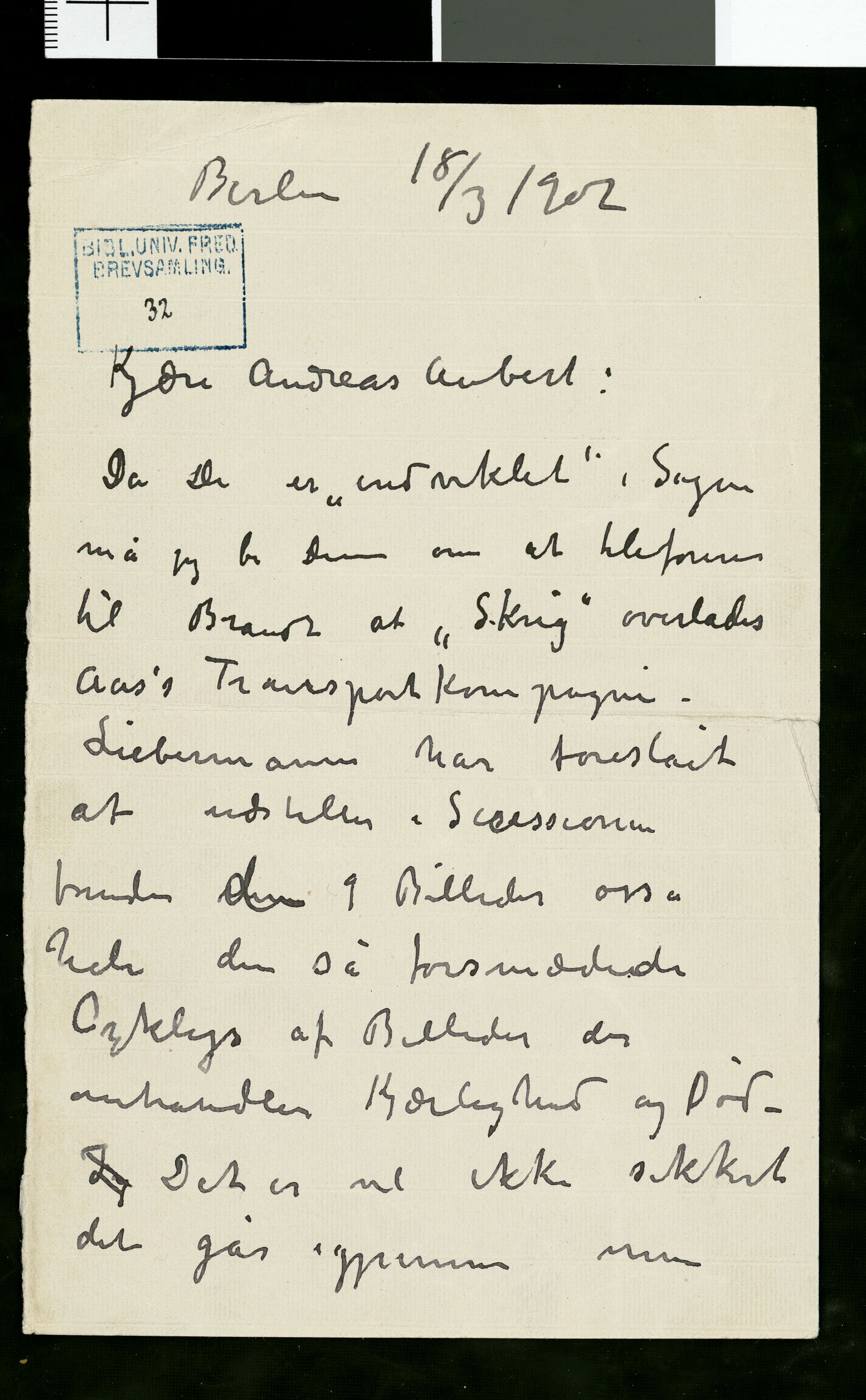 Brevs. 32 (PN 187), Nasjonalbiblioteket. Datert 18.3.1902. Brev til Andreas Aubert