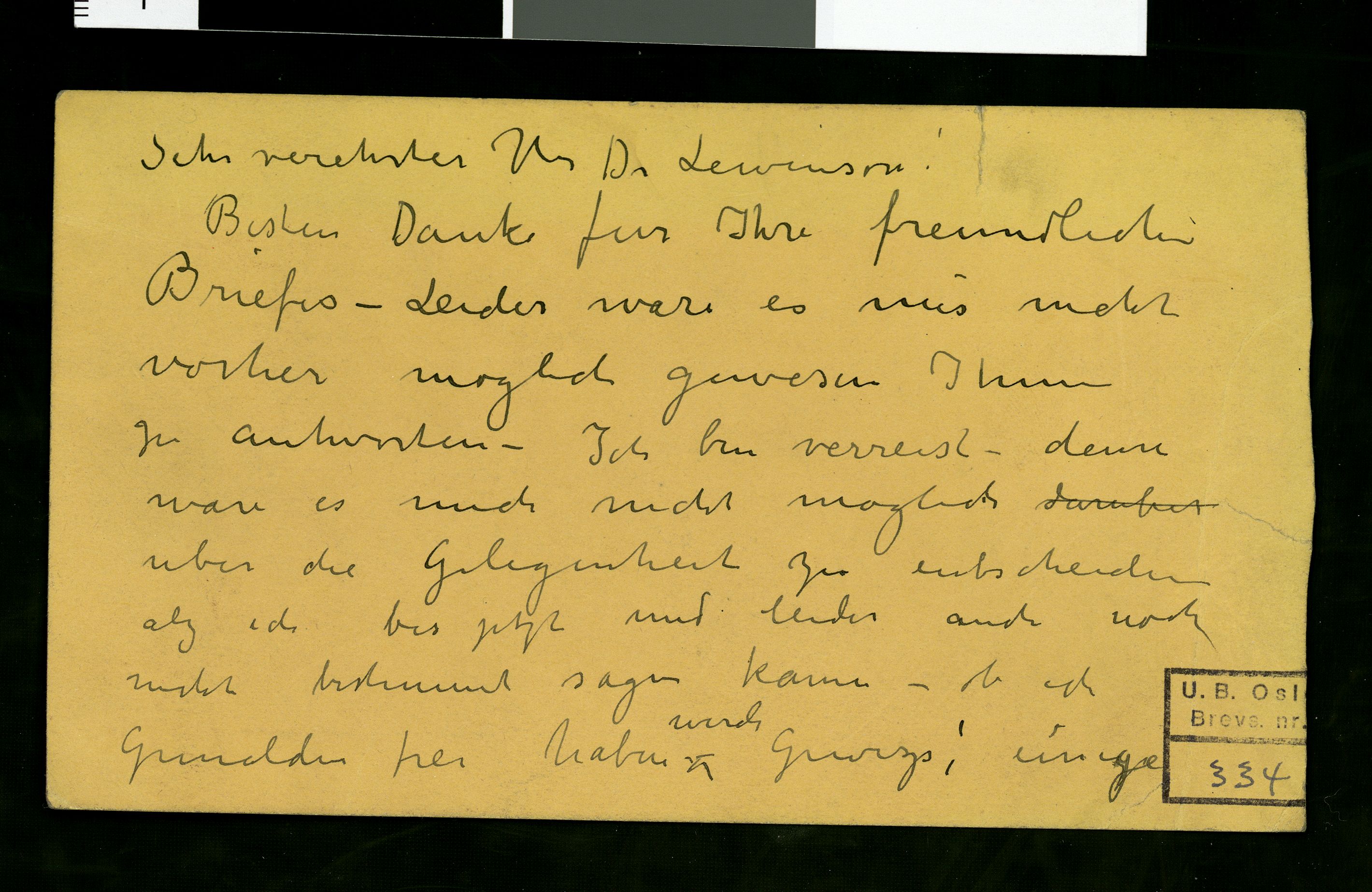 Brevs. 334 (PN 251), Nasjonalbiblioteket. Datert 1914. Brev til Levinson