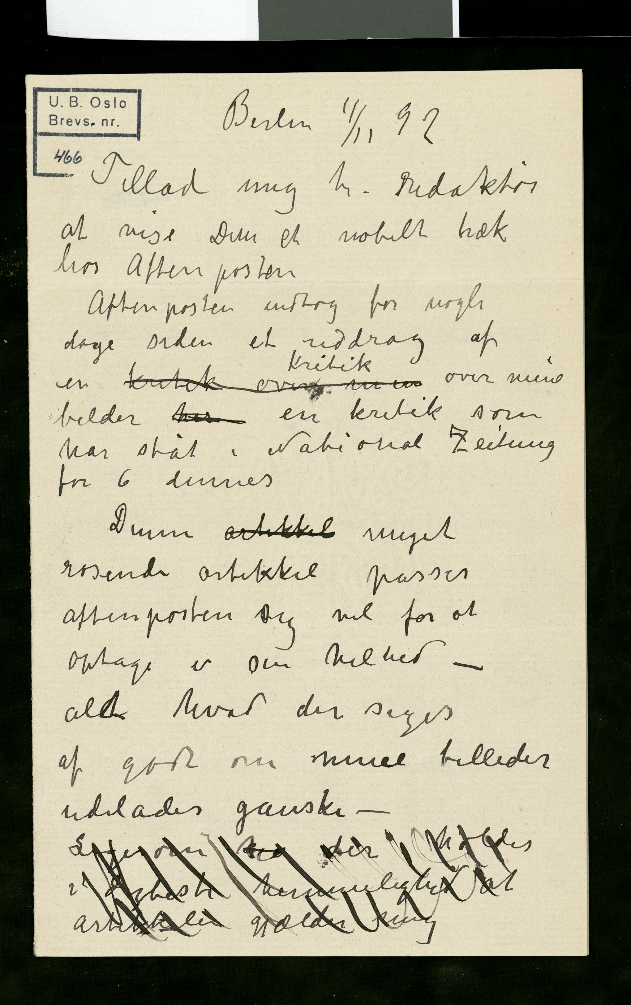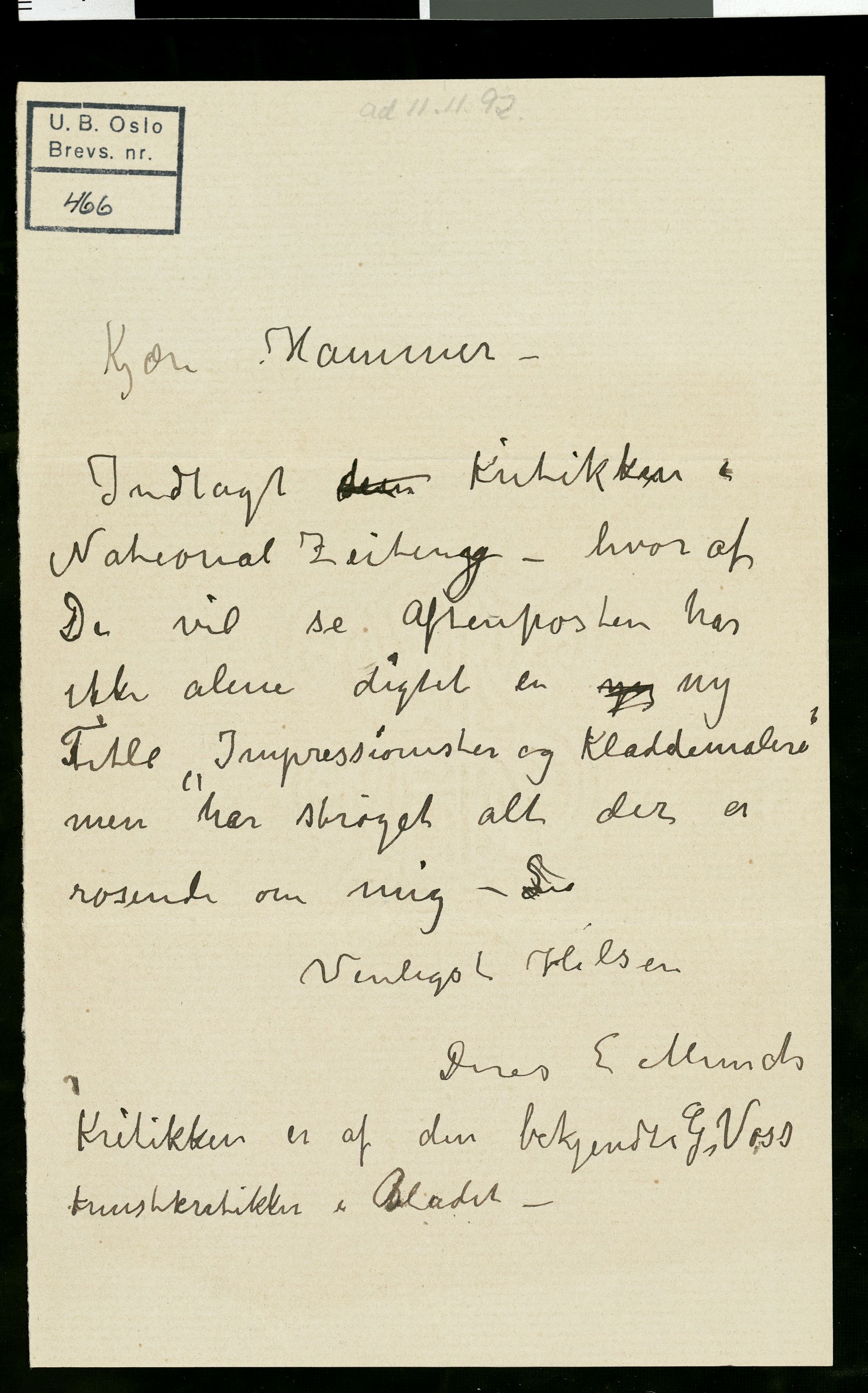 Brevs. 466 (PN 264), Nasjonalbiblioteket. Datert 11.11.1892. Brev til Karl Vilhelm Hammer