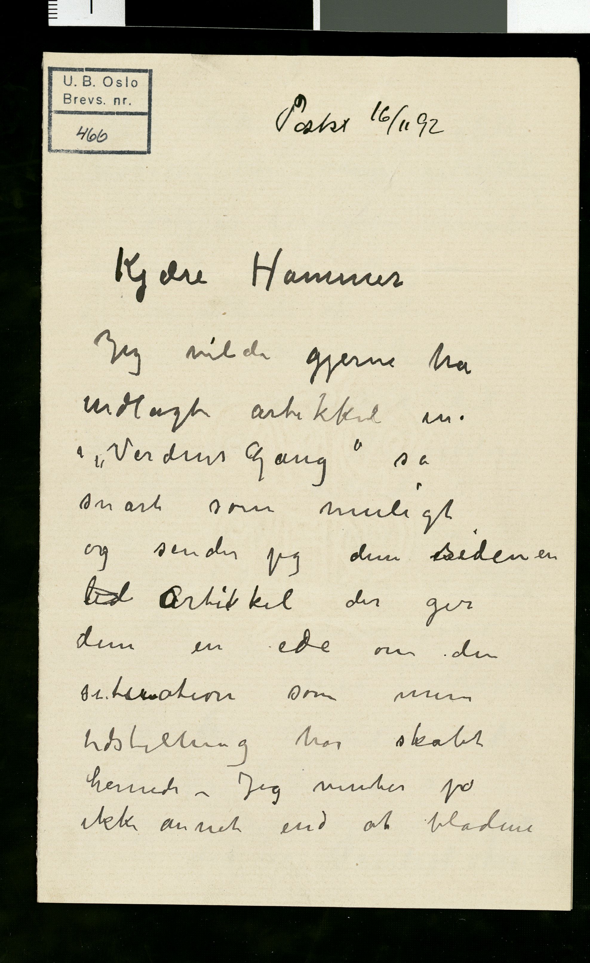 Brevs. 466 (PN 265), Nasjonalbiblioteket. Datert 16.11.1892. Brev til Karl Vilhelm Hammer