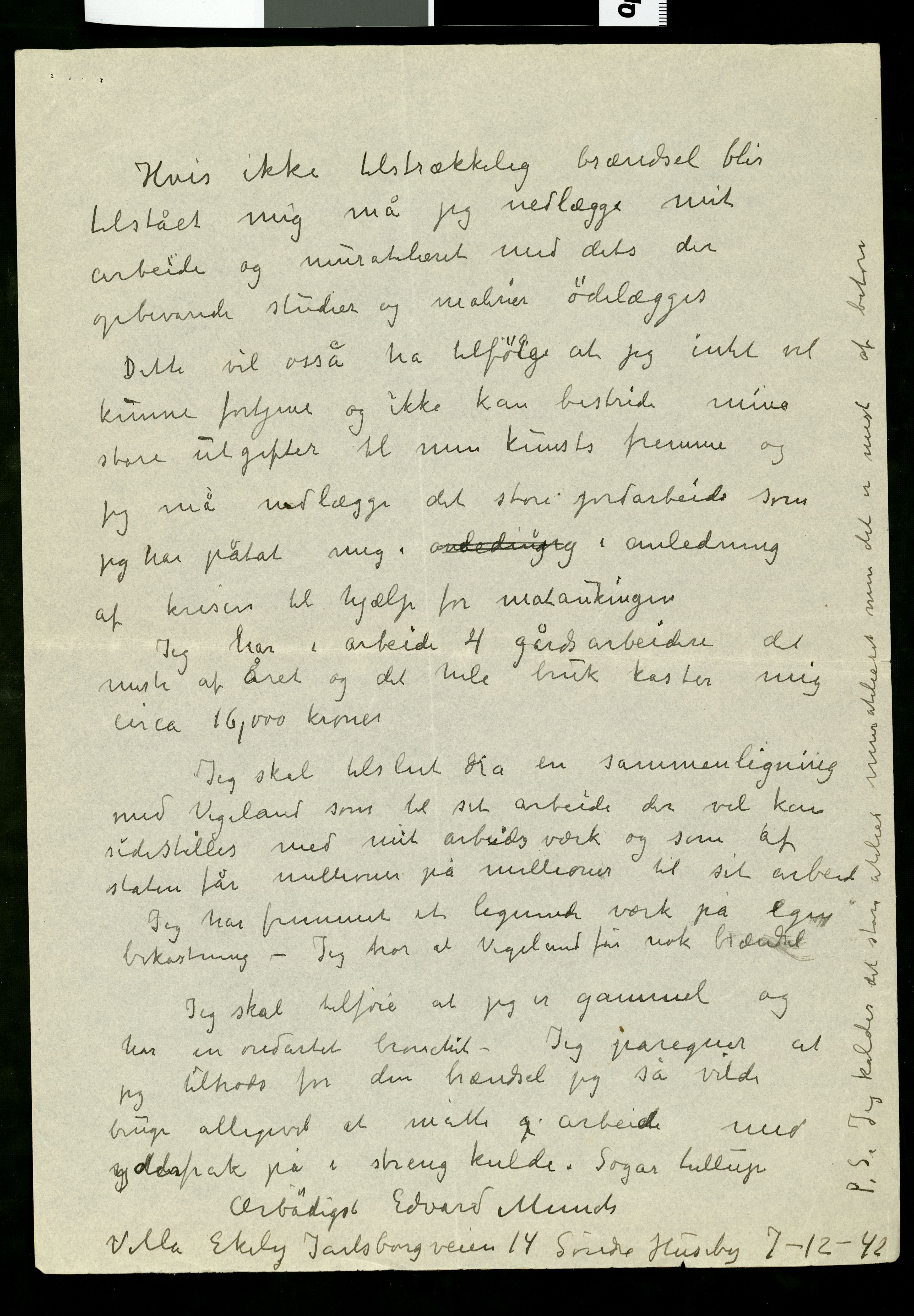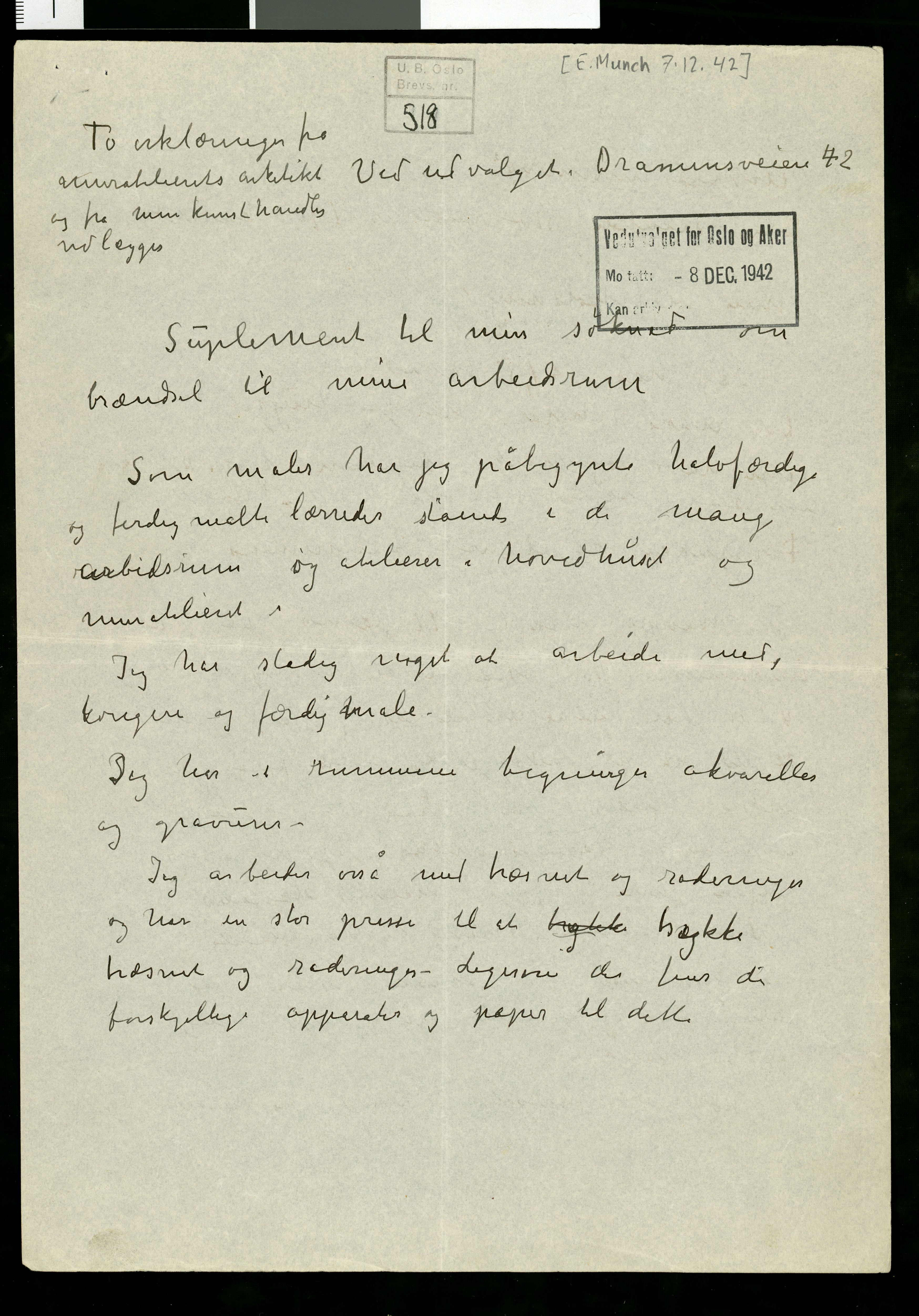Brevs. 518 (PN 310), Nasjonalbiblioteket. Datert 7.12.1942. Brev til Vedutvalget for Oslo og Aker