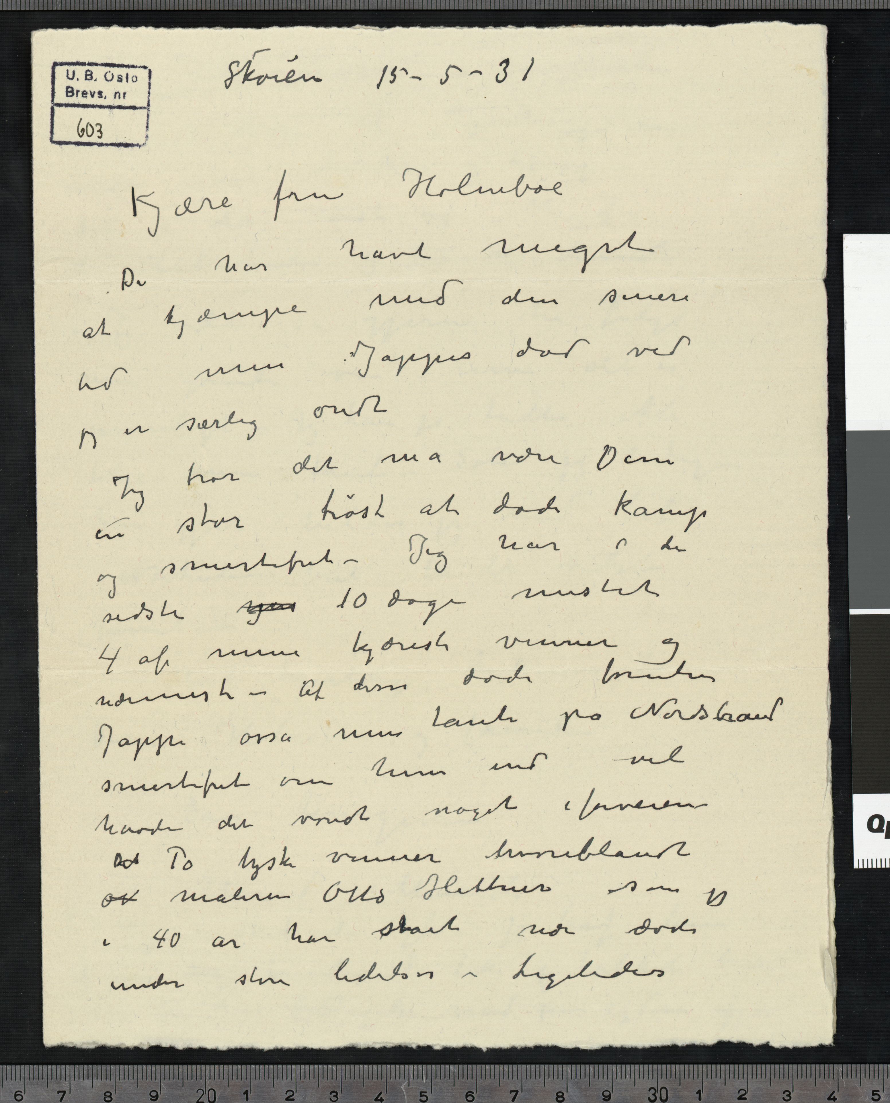 Brevs. 603 (PN 318), Nasjonalbiblioteket. Datert 15.5.1931. Brev til Julie Holmboe