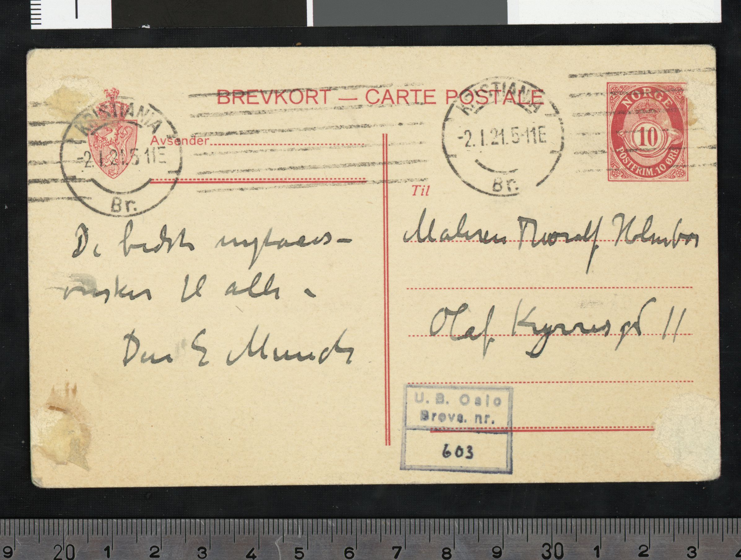 Brevs. 603 (PN 329), Nasjonalbiblioteket. Datert 2.1.1921. Brev til Thorolf Holmboe