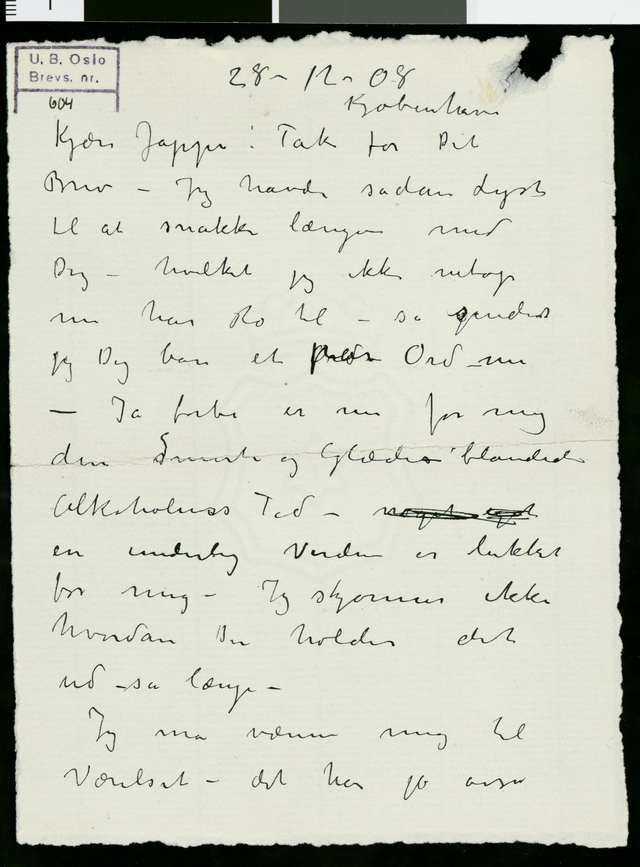 Brevs. 604 (PN 712), Nasjonalbiblioteket. Datert 28.12.1908. Brev til Jappe Nilssen