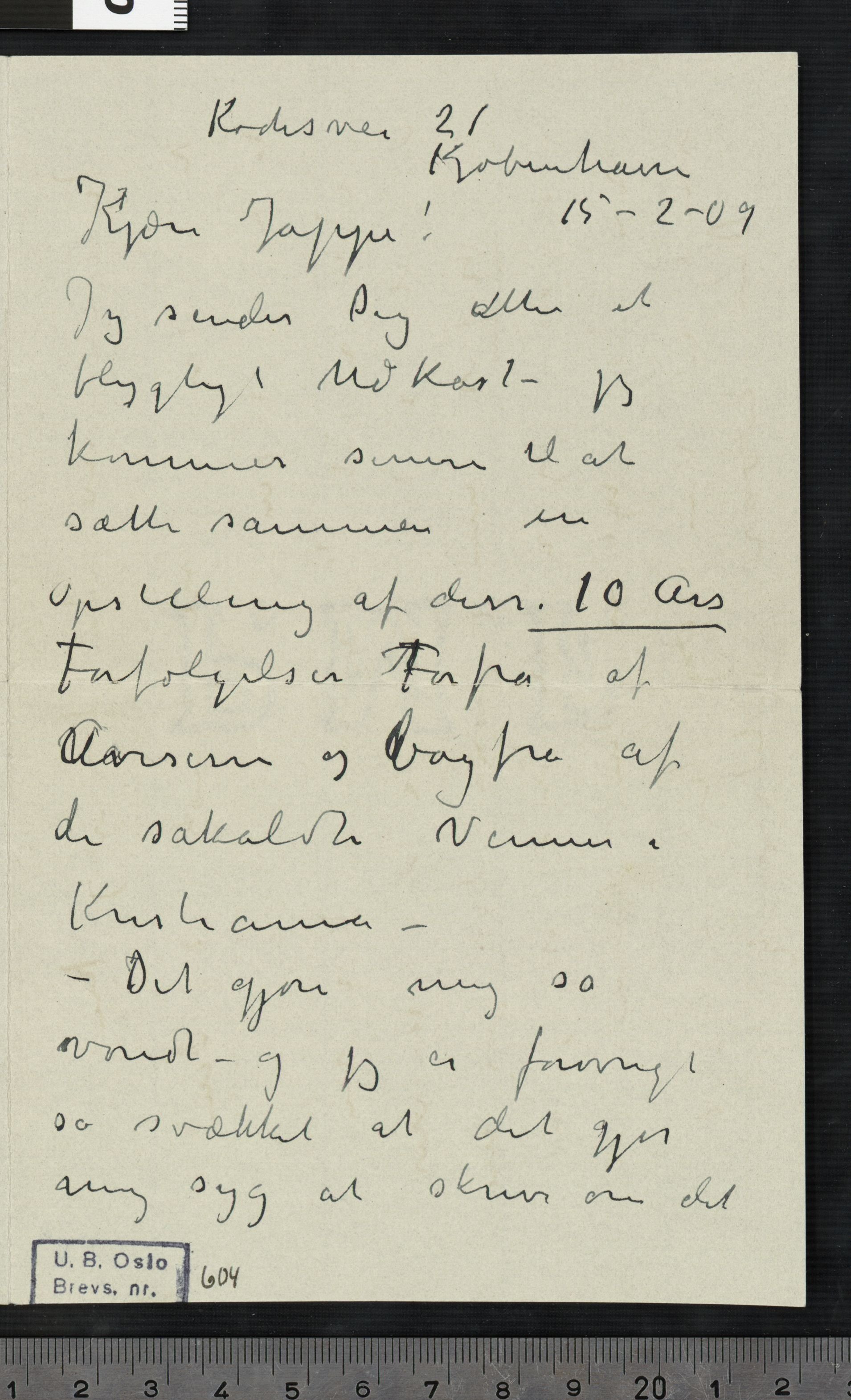 Brevs. 604 (PN 717), Nasjonalbiblioteket. Datert 15.2.1909. Brev til Jappe Nilssen