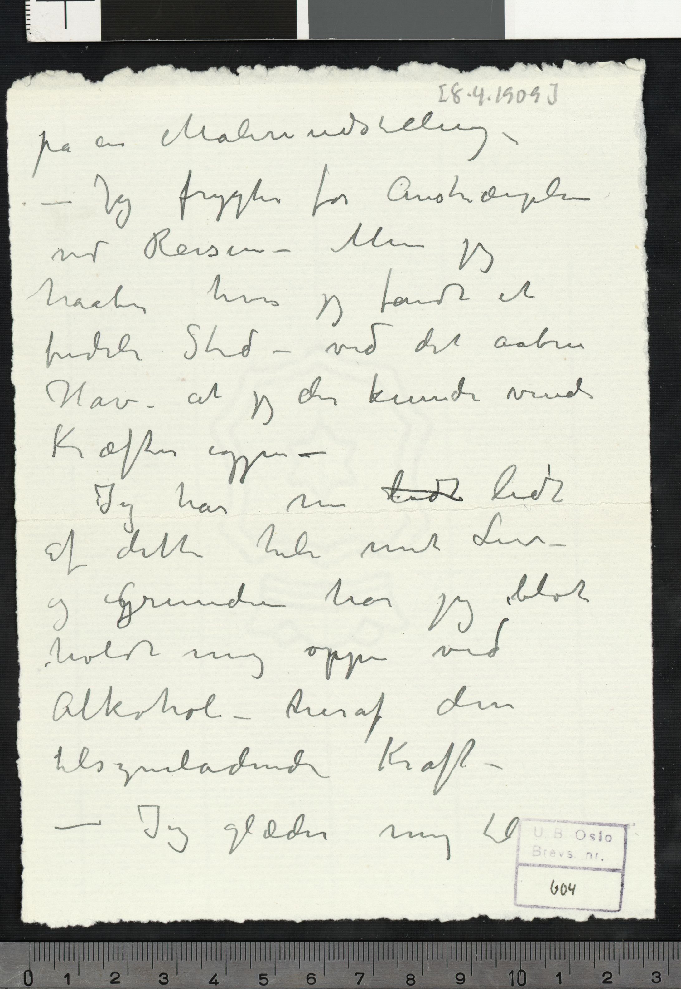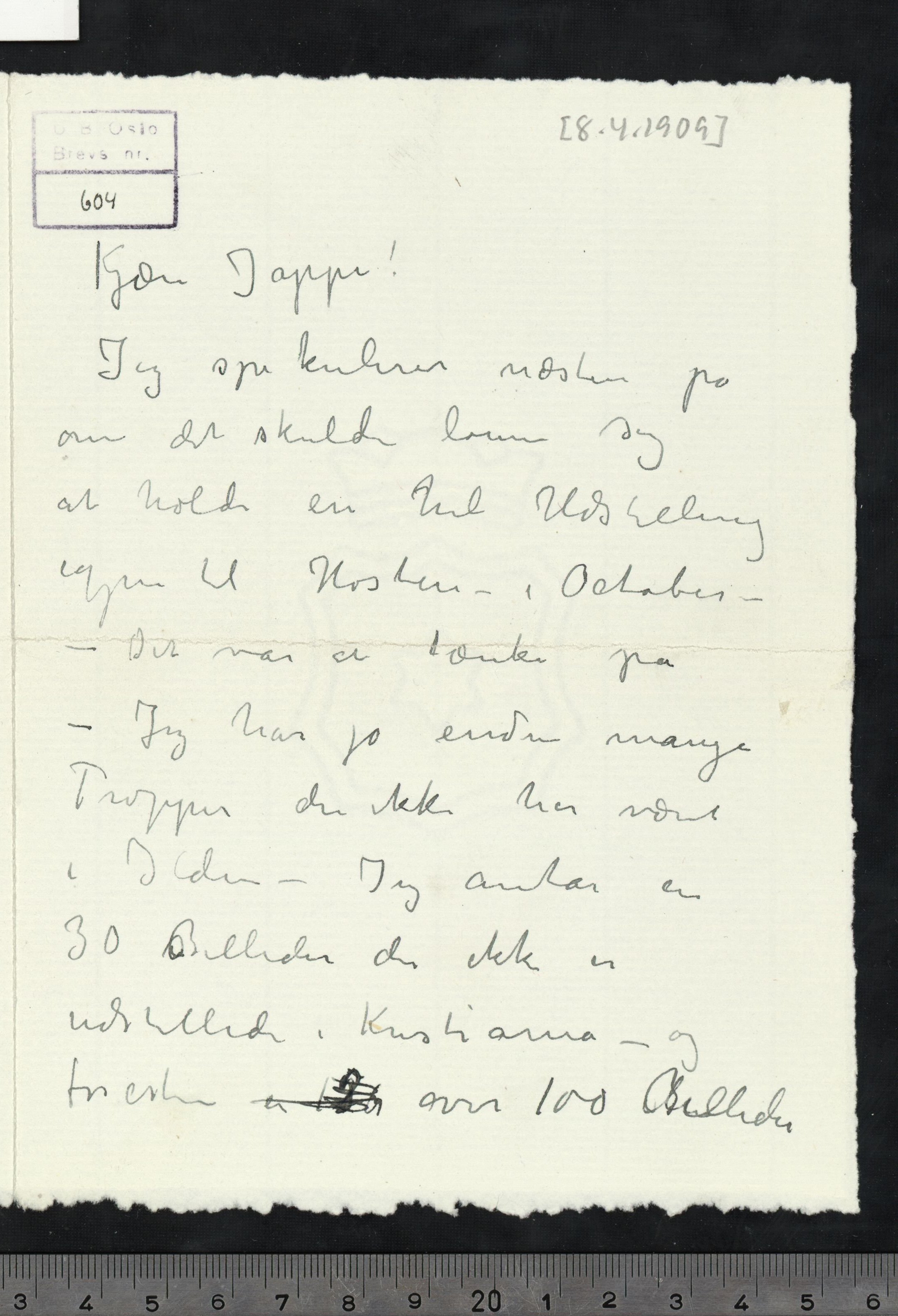 Brevs. 604 (PN 727), Nasjonalbiblioteket. Datert 8.4.1909. Brev til Jappe Nilssen