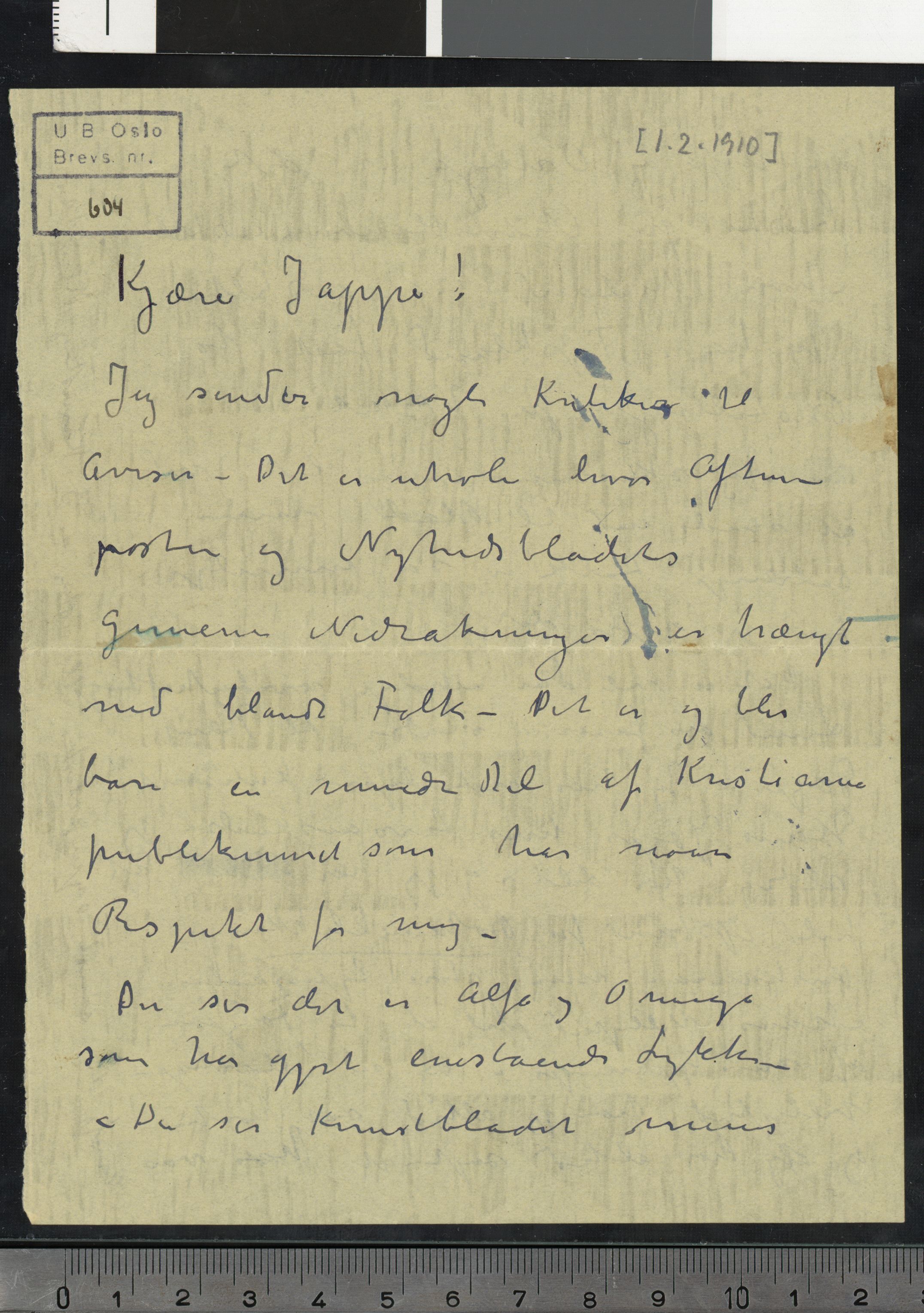 Brevs. 604 (PN 733), Nasjonalbiblioteket. Datert 1.2.1910. Brev til Jappe Nilssen