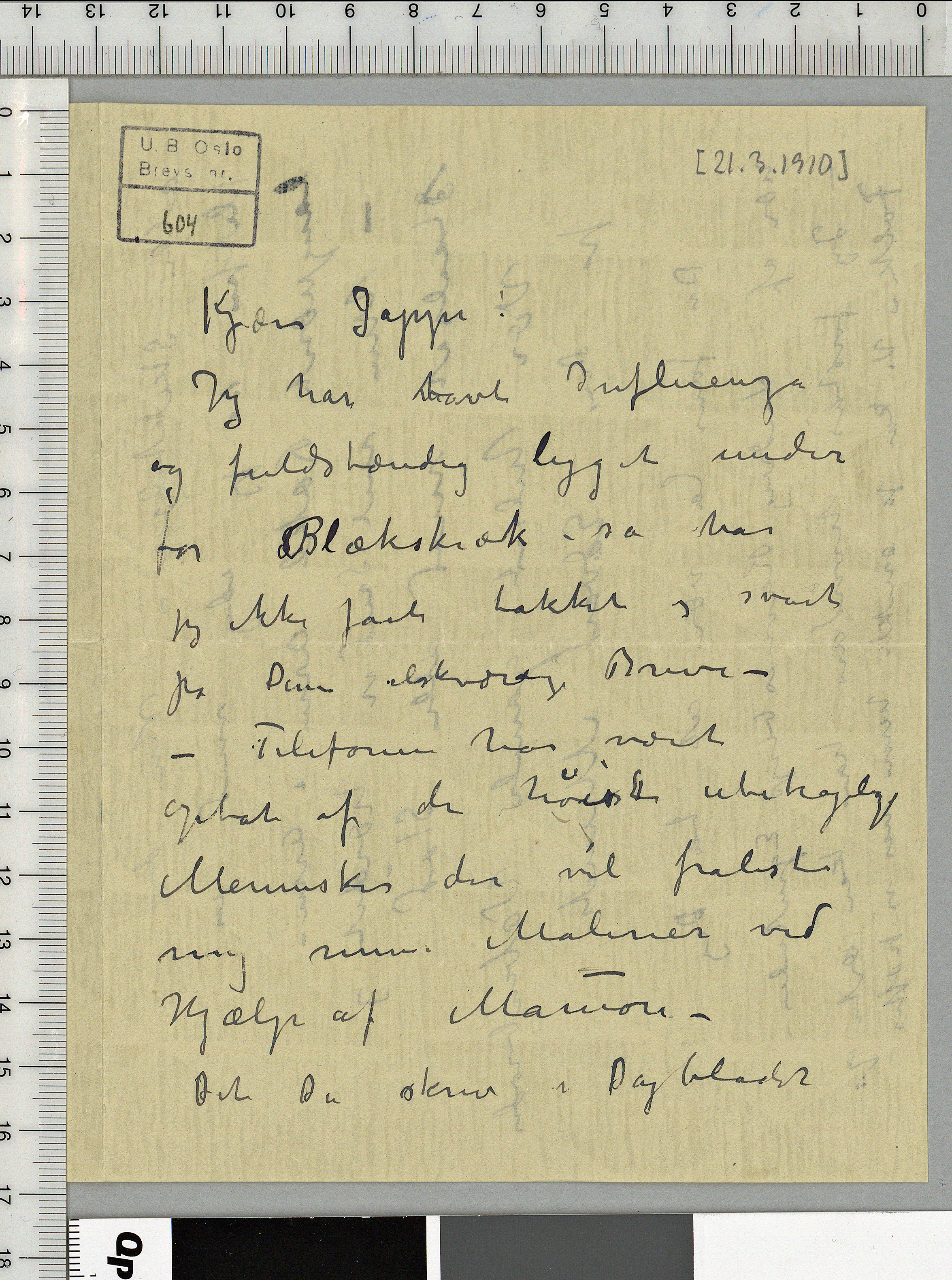 Brevs. 604 (PN 734), Nasjonalbiblioteket. Datert 21.3.1910. Brev til Jappe Nilssen