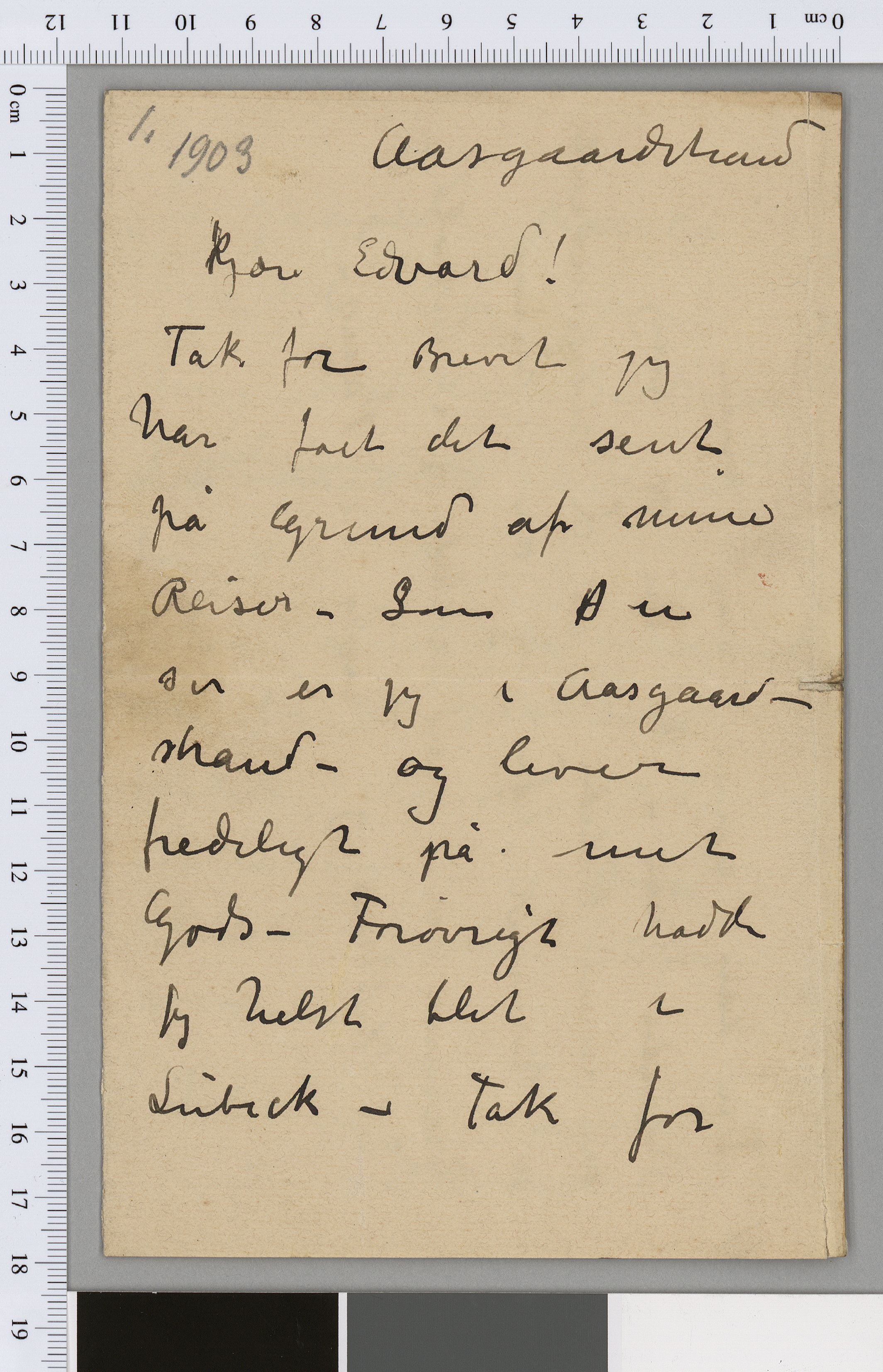 Ms.fol. 2071:1:24 (PN 767), Nasjonalbiblioteket. Datert 1903. Brev til Edvard Diriks