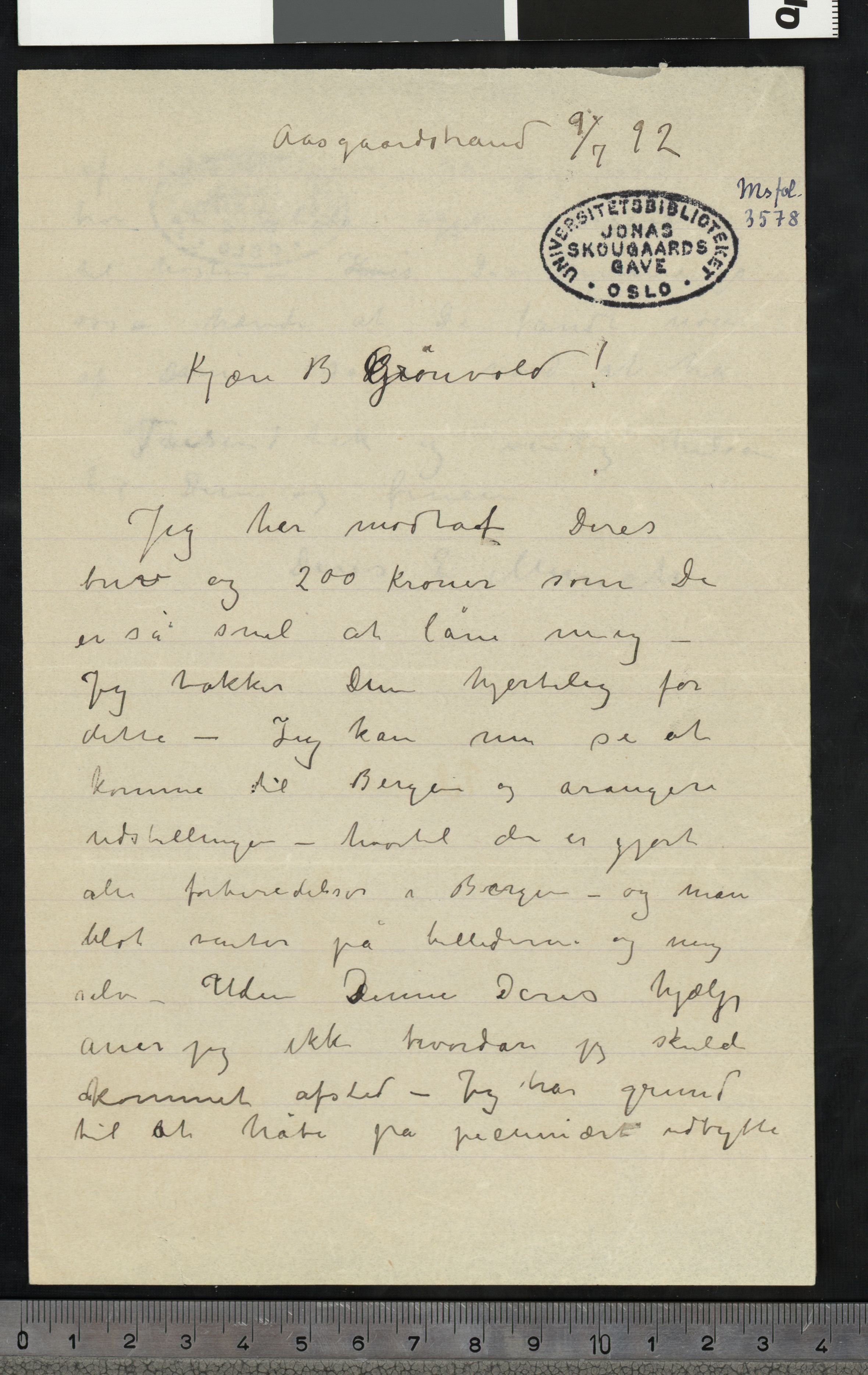 Ms.fol. 3578 (PN 774), Nasjonalbiblioteket. Datert 9.7.1892. Brev til Bernt Grønvold