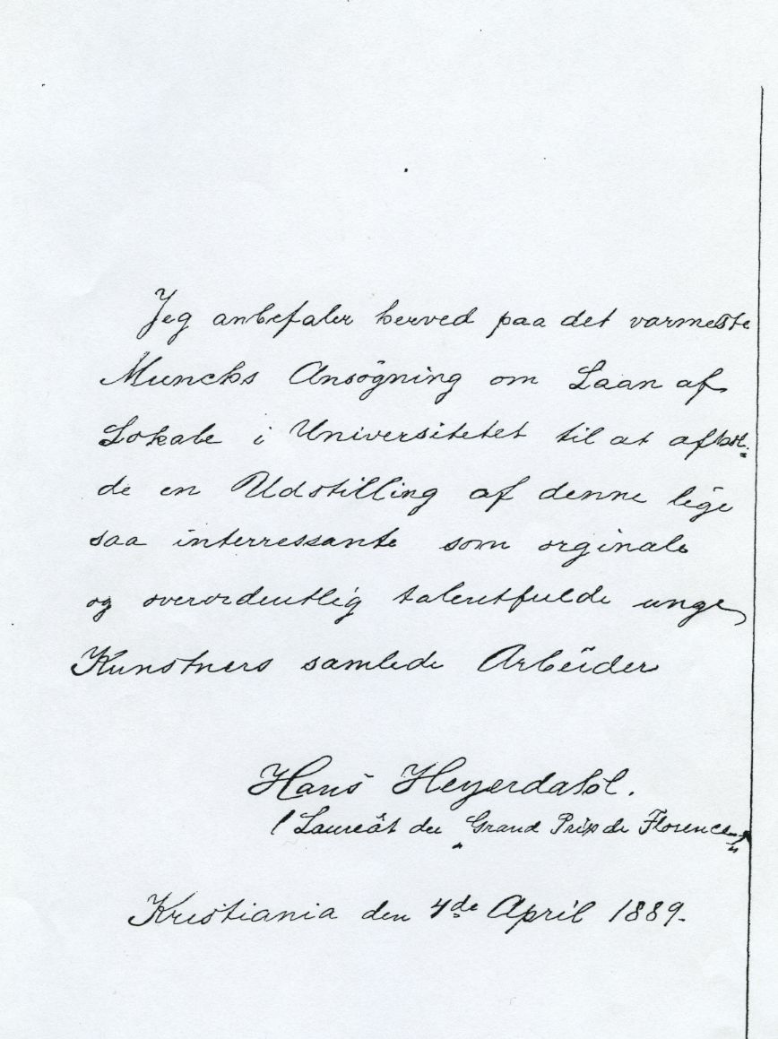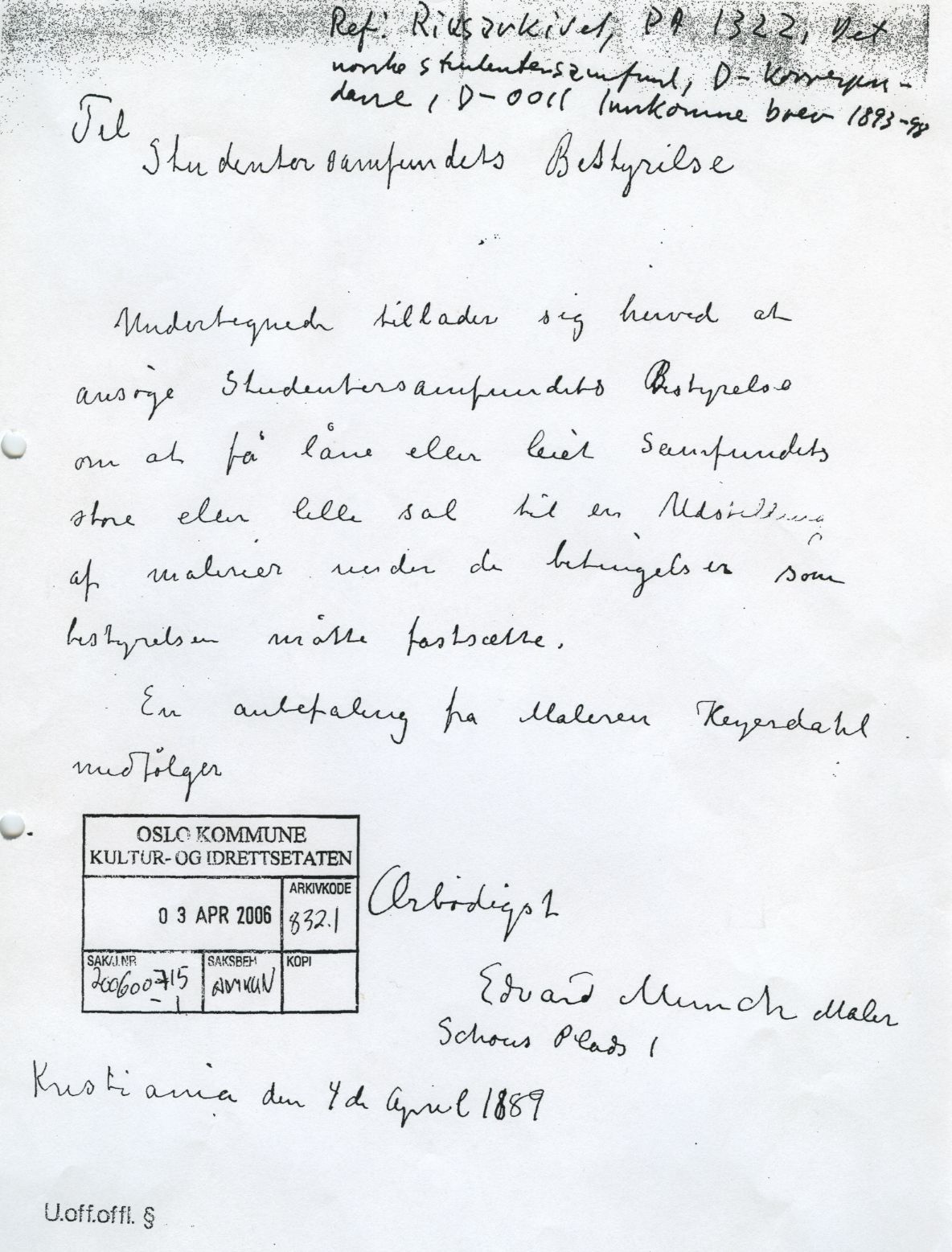 PA 1322 (PN 1072), Riksarkivet. Datert 4.4.1889. Brev til Det Norske Studentersamfund