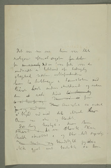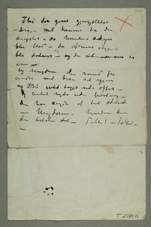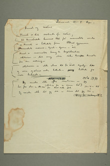 «Kunst er det motsatte af natur, Et kunstværk kommer blot fra menneskets indre – Kunst er billedets form tilblivet gjennem { … }Menneskets nerver – hjerte – hjerne – øie Kunst er menneskets trang til krystalisation Naturen er det evig store rike hvorf{ … }ra kunsten får sin næring. – Naturen er ikke alene det for øiet synlige – de{t}n er osså sjælens indre billeder –på øbilleder paa øiets bakside –»