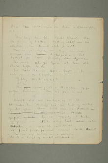 «Vil De gjøre mig den tjeneste{og}at gjøreOlaf Schou et forslag som jeg selv ikke tør komme med – Jeg sender ham foruden det syge barn to andre større billeder, – en … som jeg{ … }gjerne{skal}vilde han skulde beholde – indtil disse blir senere engang skulde blive solgte for en større pris{–}; –{ … }Jeg men{er}te at han da skulde trække af for sig hvad han nu låner mig – Gjør dette så er De snil på en»