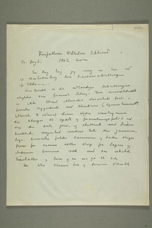 «Jeg takker for den ærefulde Indbydelse og skal sende et Udvalg Gravurer –{N … }Jeg{ … }sender {jeg}med de bedste af de i Kunst- foreningen i fjor udstillede – det var jo forholdsvis få der fik dem at se – Jeg sender osså et Udvalg ikke før udstillede{ … }Gravürer –»
