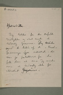 «Vil Du være så snil at{ … }bringe indlagte Brev og Notits op tilMorgenbladet – jeg synesMorgenbladets Pligt er at ta den ind – Morgenbladetindtog den eneste nedrakkende Kritik jeg fik –Men UdsJeg har aldrig bleven så udmærket behandlet i Pressen –»