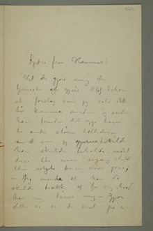«Det er vistnok ikke meget godt medfrfisket nordpå efter hva jeg læser aviserne – Forsåvidt stemmer det med detAndreafortæller i sit sidste brev, hvor hun fortæller at hun forat sparestelhar opsagt piken og selv steller hele huset med Ku og gris. – Jeg tror nu ikke så ganske på alt hva hun sier da jeg har erfaring for at hun ikke er så nøie med sandheten – Det mærket jeg da hunfortæller fortalte mig at Du havde skrevet til hende at jeg var villig til at betale for guttene –»